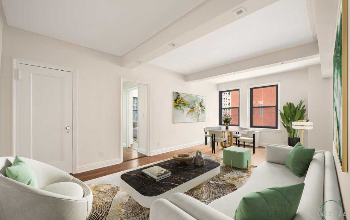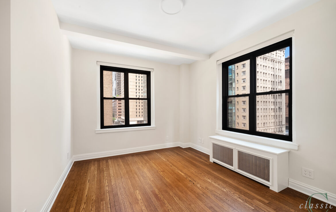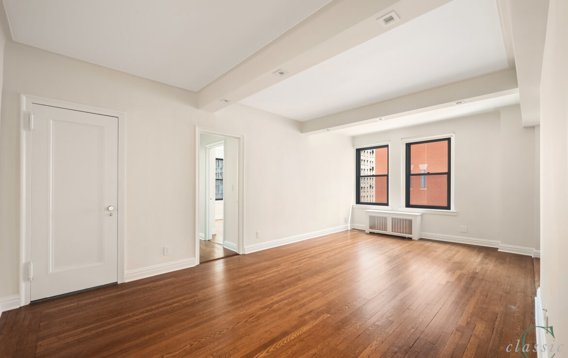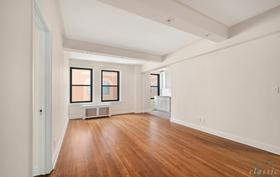 Unit 605 is a bright and spacious corner one bedroom with elegant prewar details.