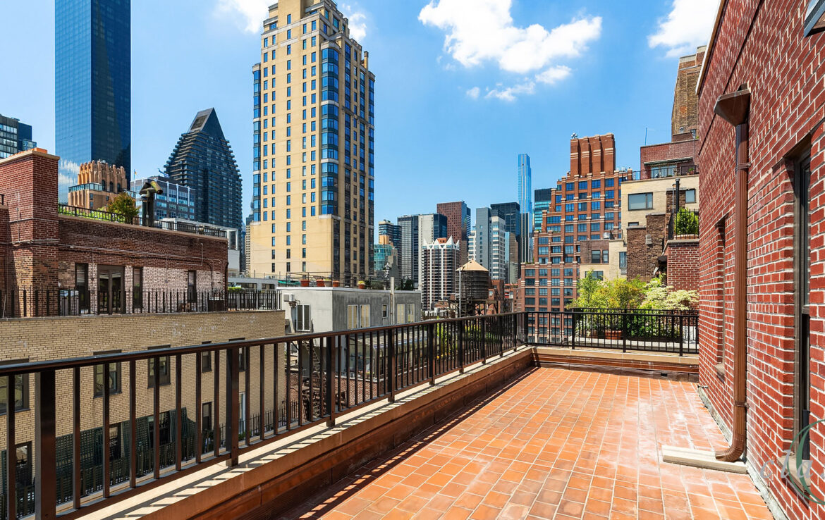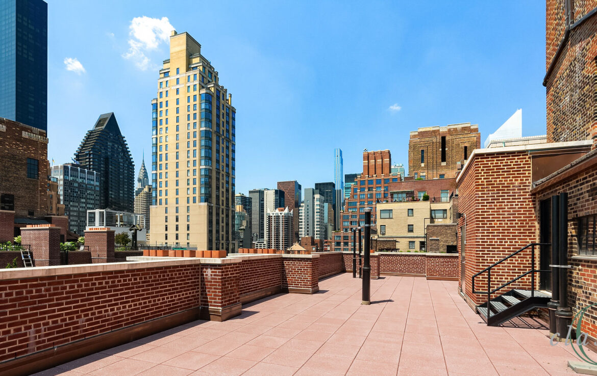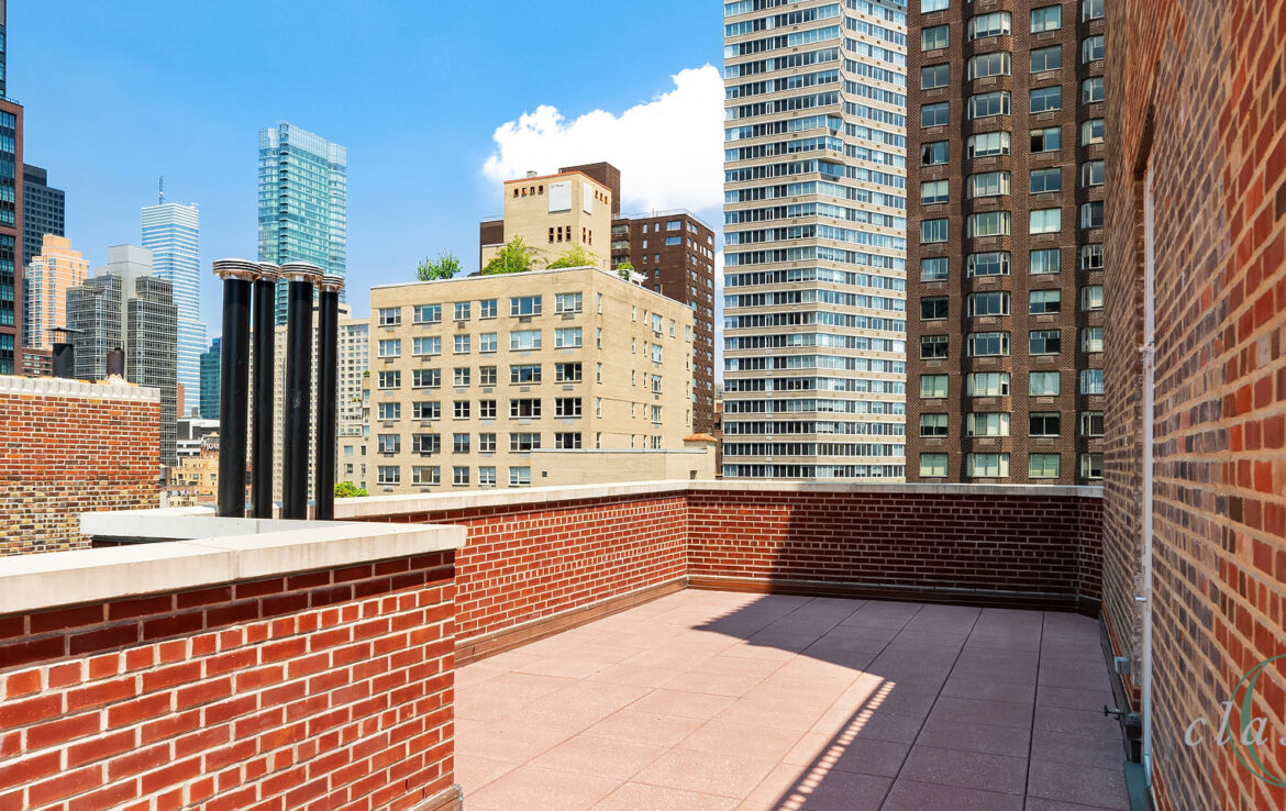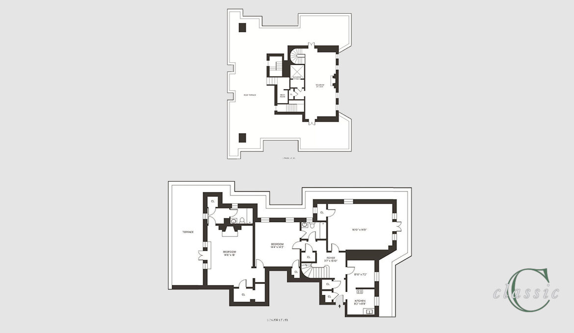 The spiral staircase which leads to the next level of this duplex penthouse is also an example of Emery Roth’s fine sense of balance and proportion. PHC level 1 is also wrapped in private terrace. On this level one could create 2 or 3 bedrooms; it presently has 2 full windowed baths, a distinctive master suite with a wood burning fire place and another beautiful sized south facing set back terrace.